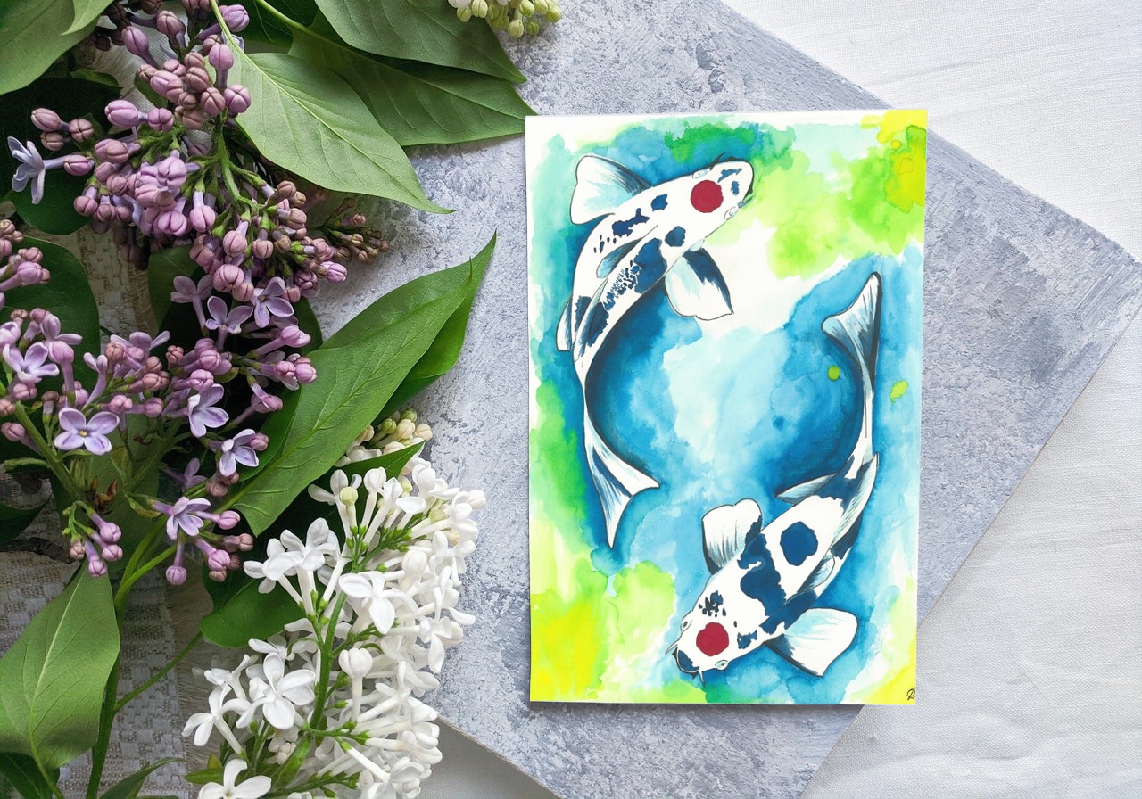 Balai de carpes koys. Dessin réalisé à l’encre sur papier Velin aquarelle 320g. Carpes vues de dessus, nage en rond Couleurs dominantes bleu/vert/jaune