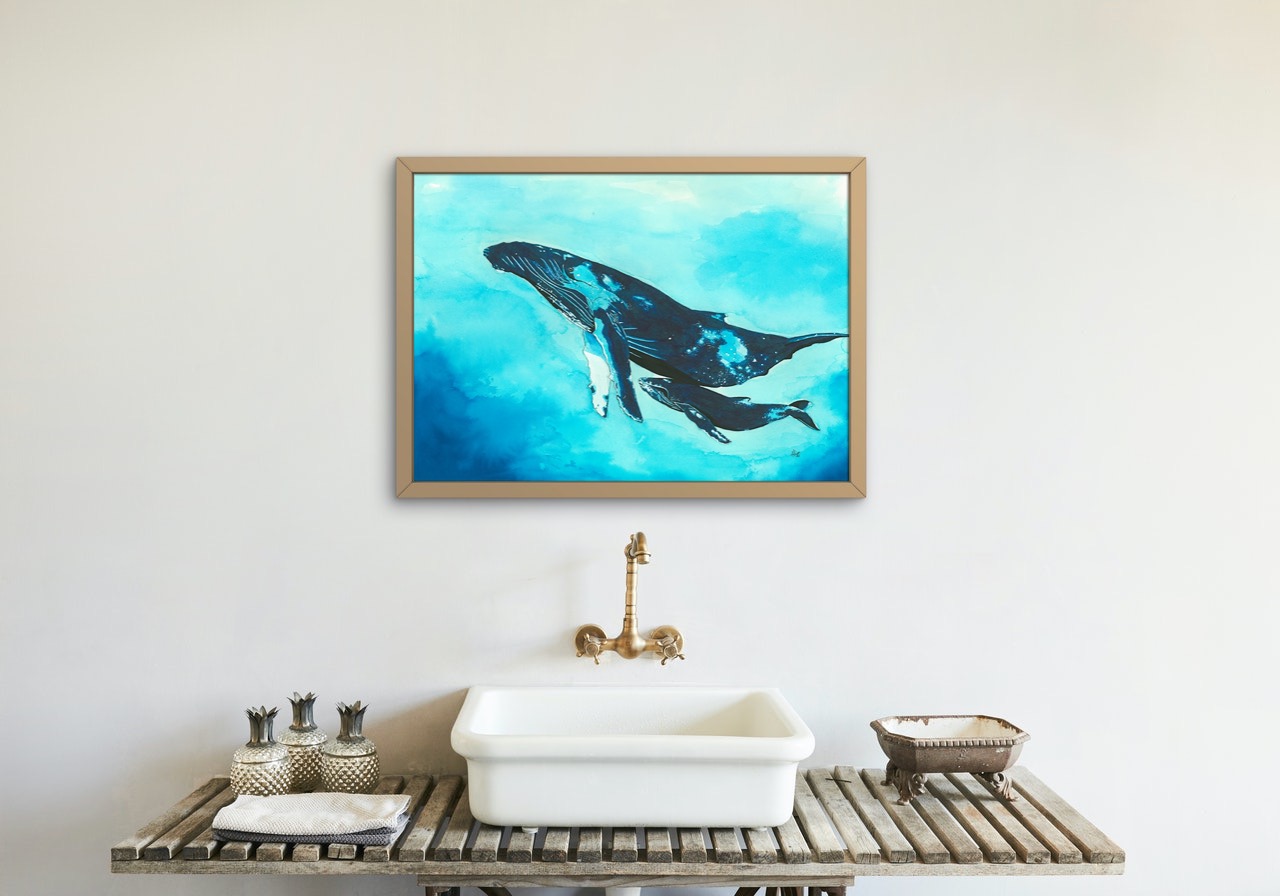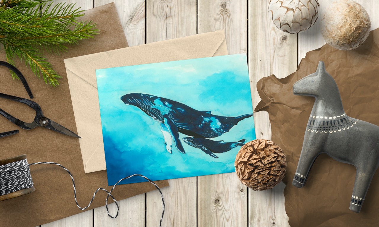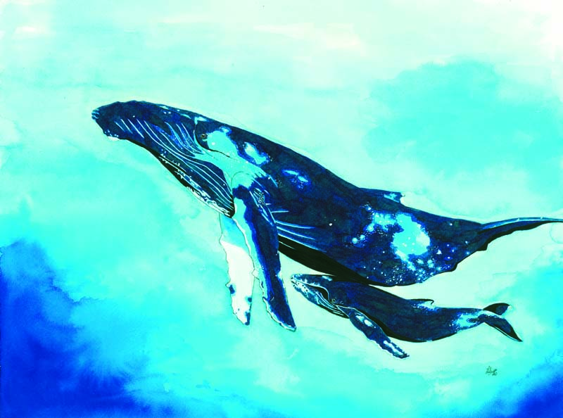 Baleine à bosse et bébé. Dessin réalisé à l’encre sur papier Velin aquarelle 320g. Couleurs dominantes bleu/turquoise