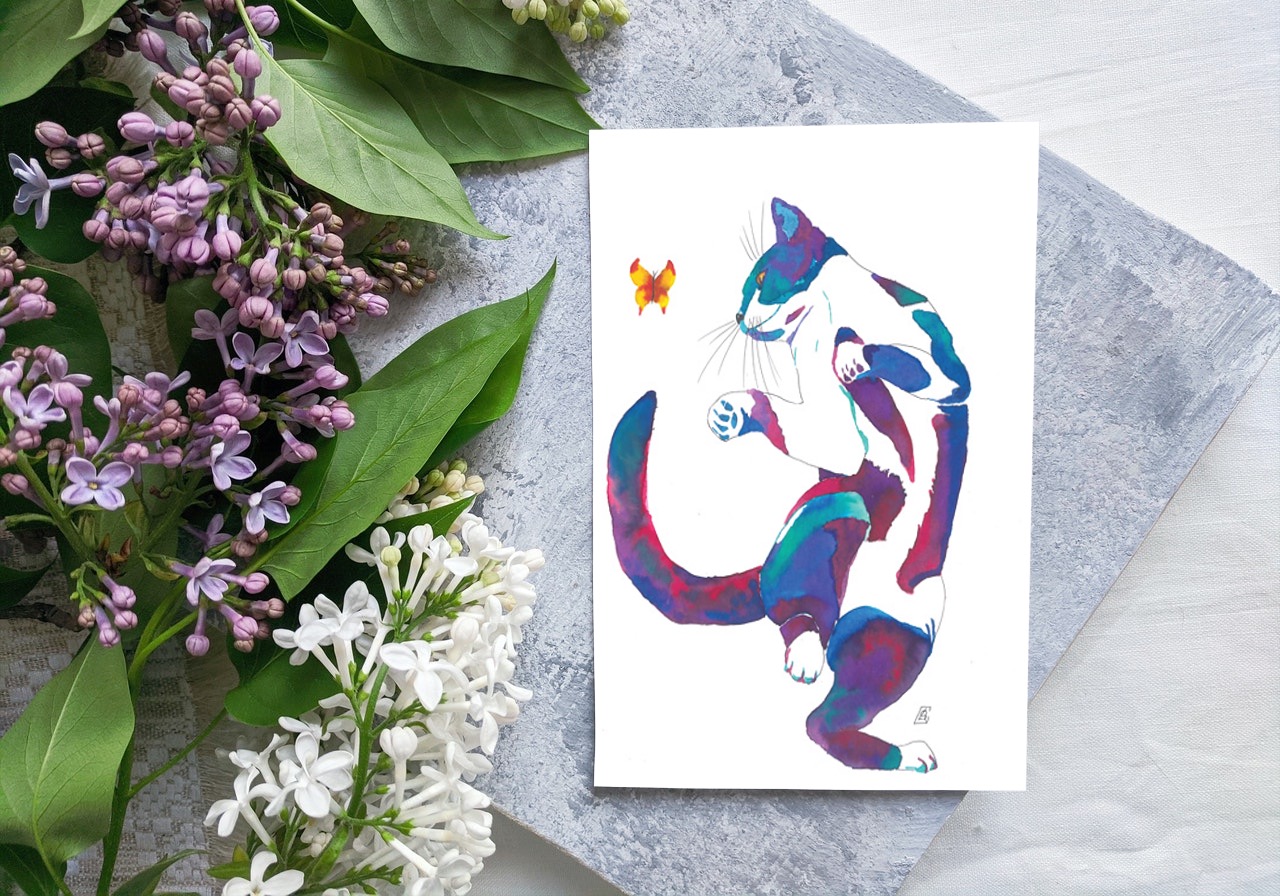 Chat sautant après un papillon. Dessin original sur Velin 320g au format 30x40cm. couleur dominantes : violet, bleu et vert.