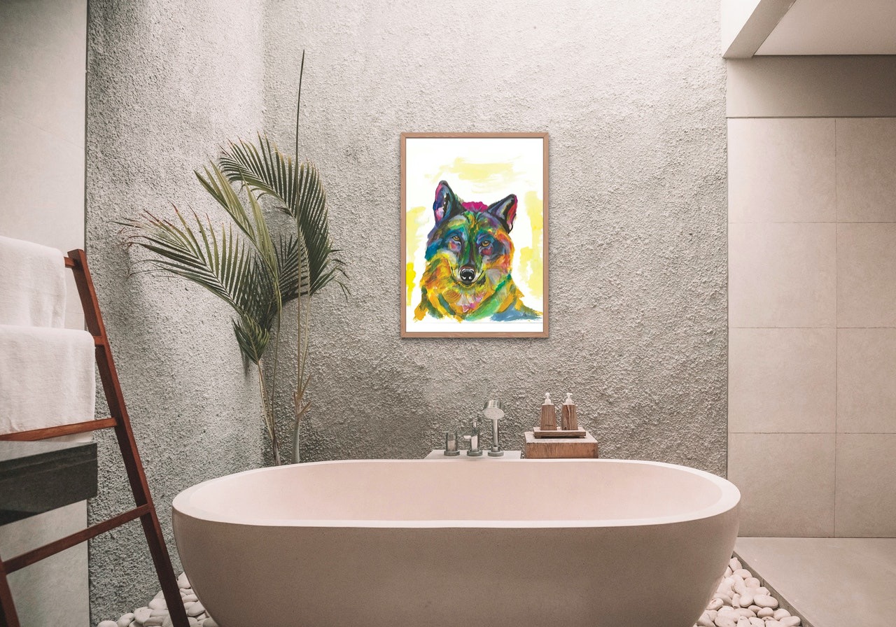 Chien-loup multicolor. Dessin original réalisé à l’encre sur Velin 320g au format 30×40.