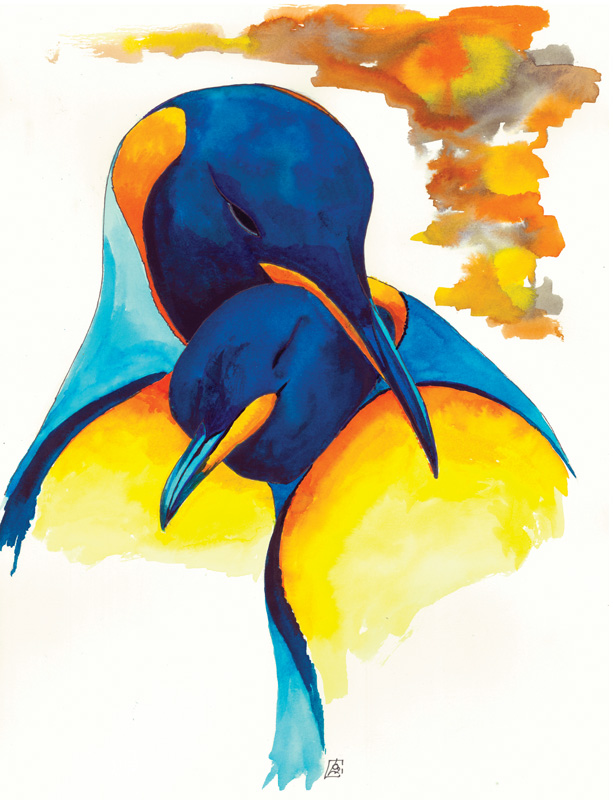 Manchots empereurs couple – multicolor. Dessin original à l’encre sur Velin 320g, au format 30×40. couleurs dominantes orange/bleu