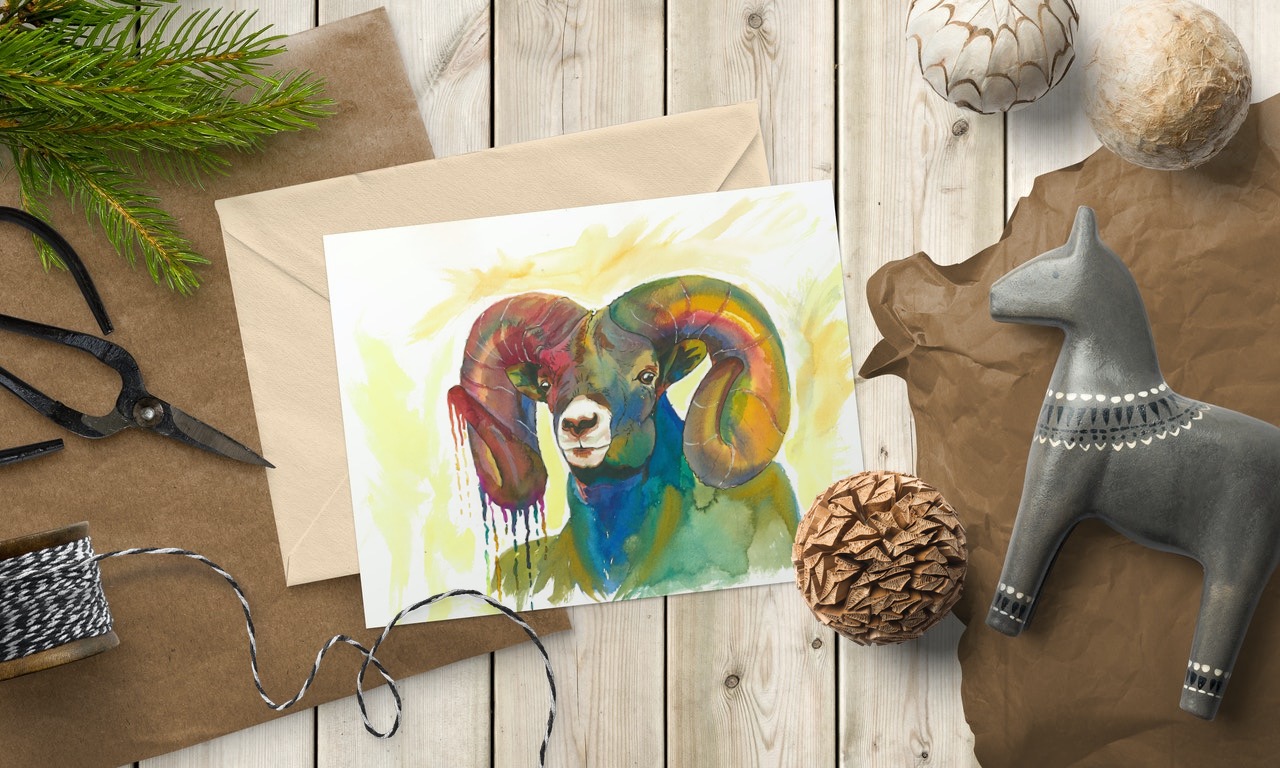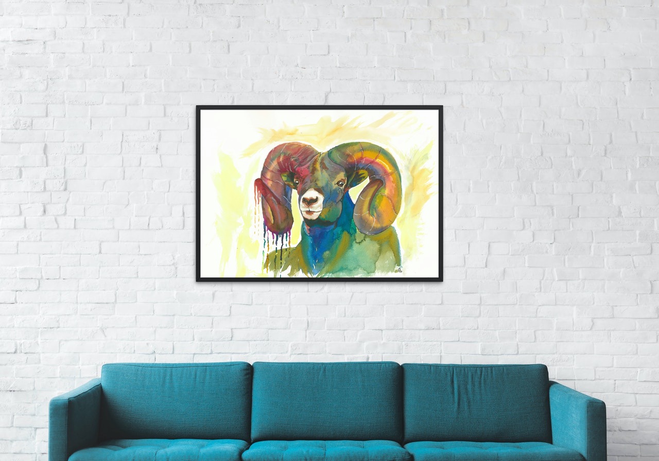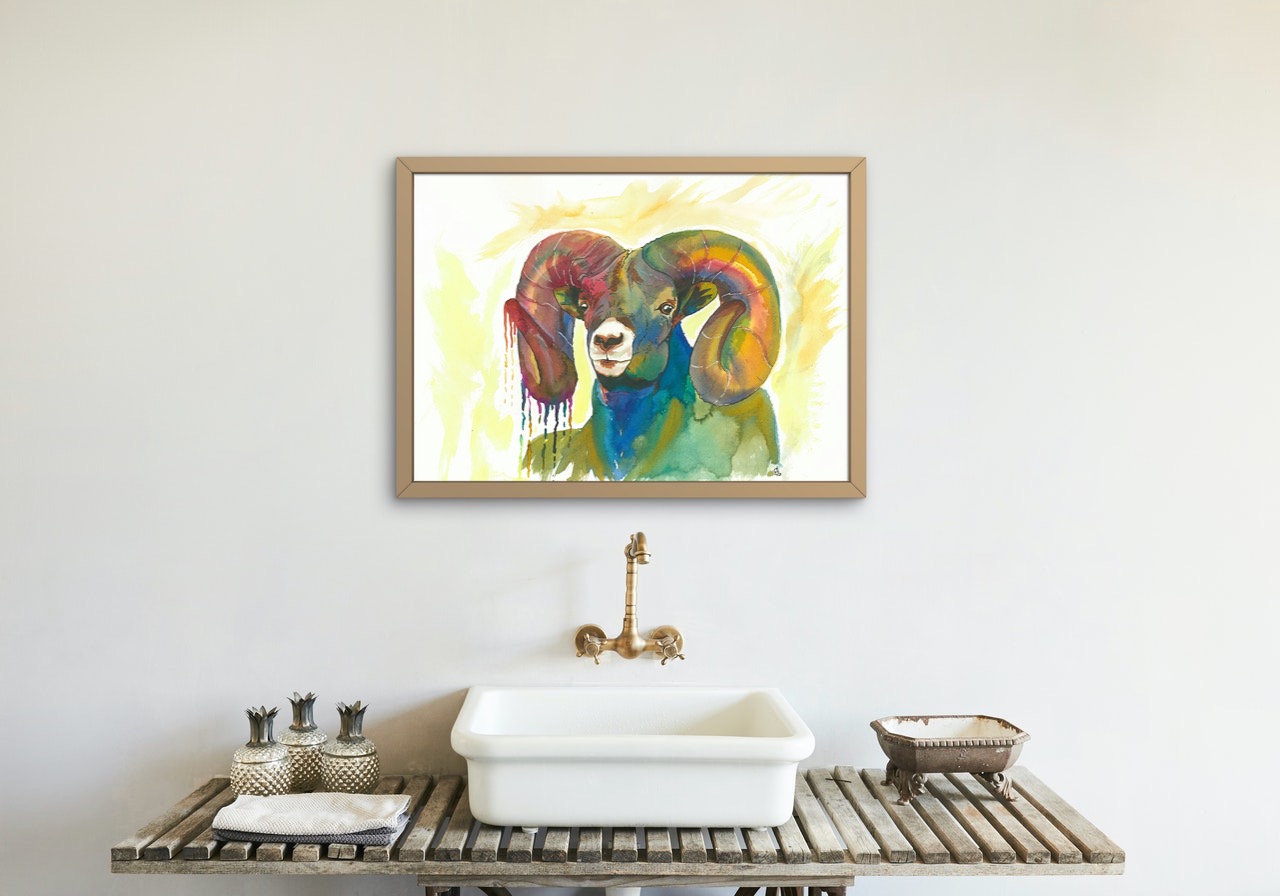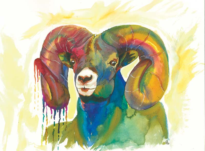 Mouflon multicolor. Dessin réalisé à l’encre sur papier Velin aquarelle 320g. Mouflon coloré stylisé, gouttes d’eau descandant des bois