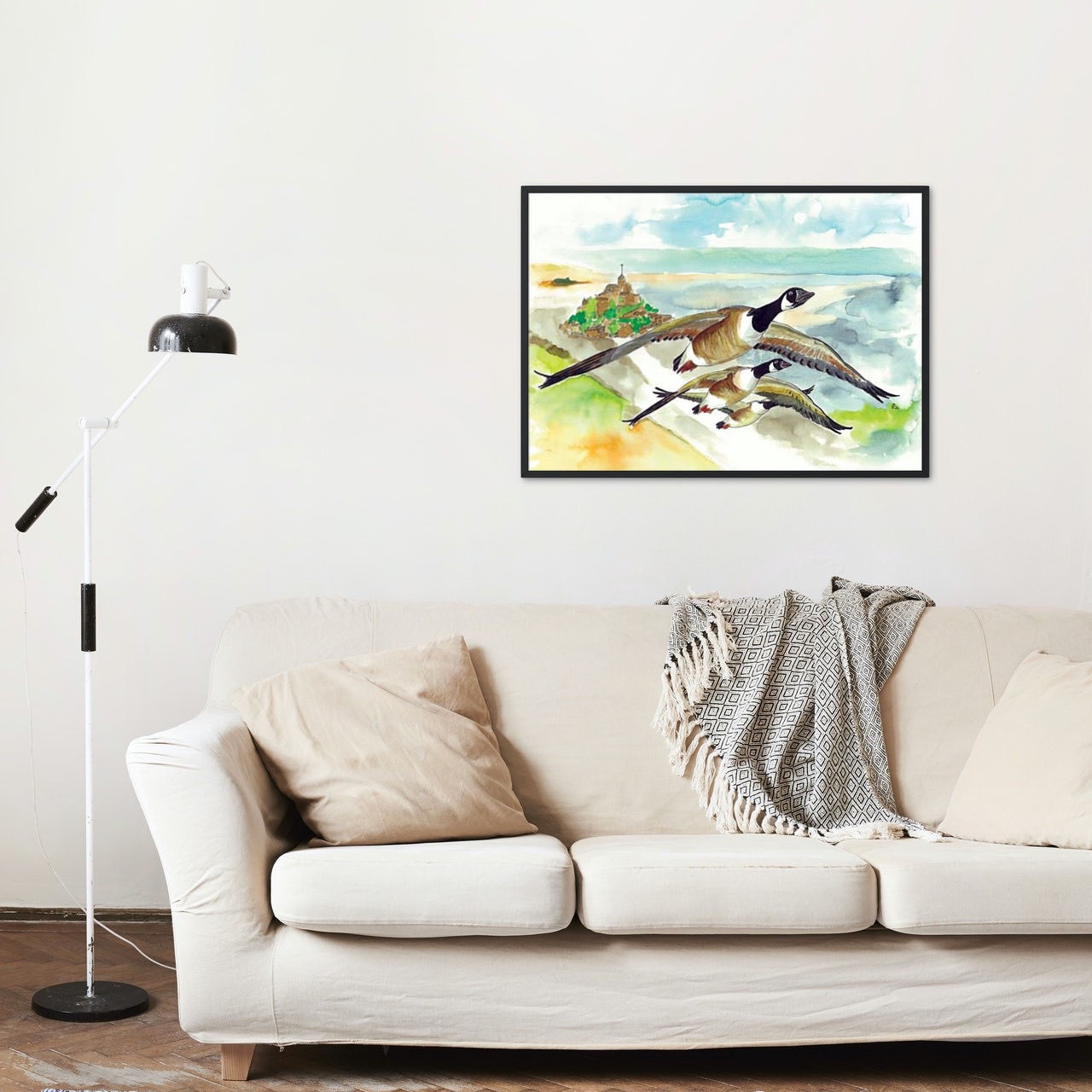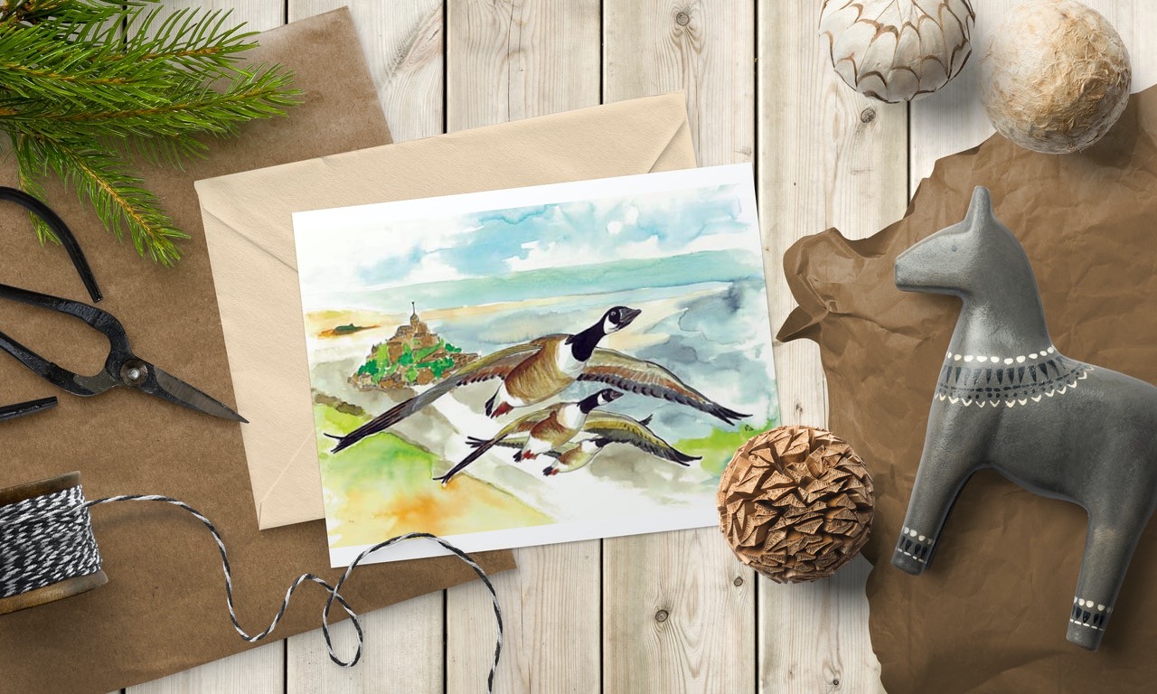 Oies Bernaches. Dessin original sur Velin 320g au format 30×40. Oies avec le Mont St Michel en arrière plan. Couleurs naturelles.