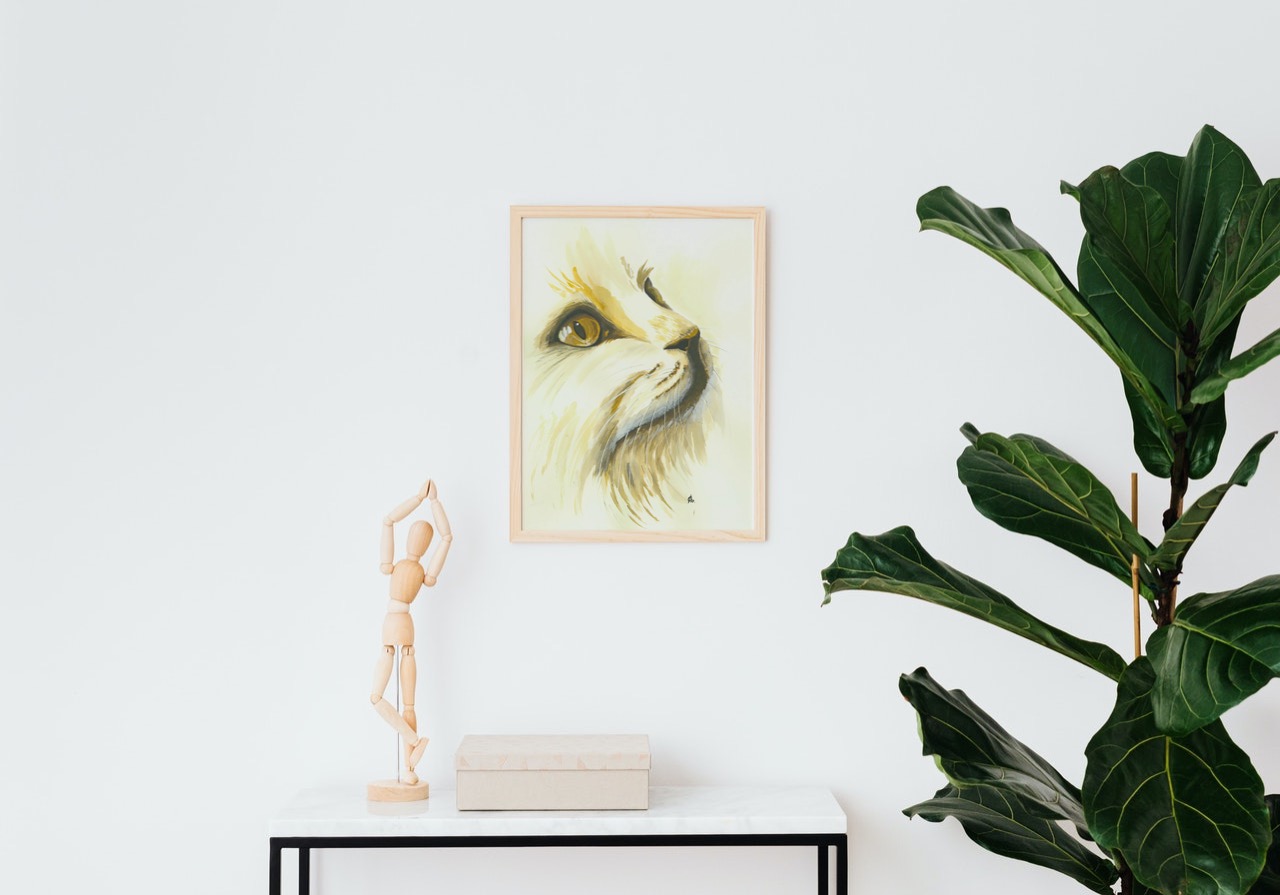 Visage chat regardant vers le haut. Dessin réalisé à l’encre sur papier Velin aquarelle 320g. Couleurs sepia dominantes
