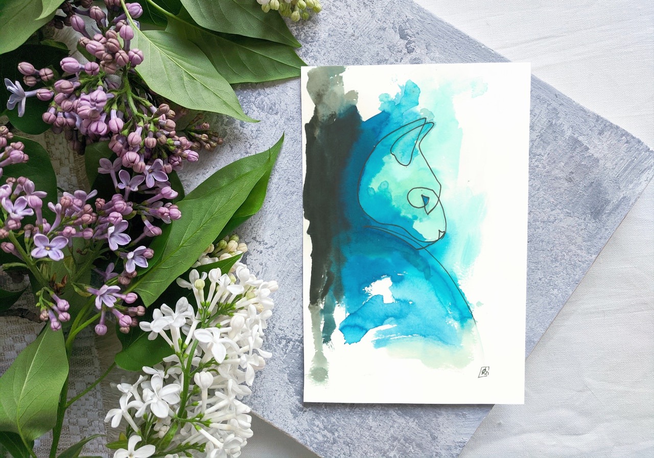 Visage chat bleu. Dessin réalisé à l’encre sur papier Velin aquarelle 320g. Visage de chat stylisé stylisé réalisé en seul trait sur fond dégradé noir/bleu.