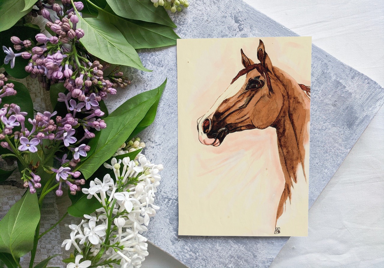Cheval tête de profil. Dessin réalisé à l’encre sur papier Velin aquarelle 320g. Couleurs dominantes bruns