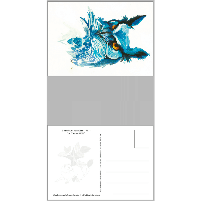 Le dessin est travaillé sur support mouillé pour obtenir un effet de fondu. Représenter un Grand Duc de face permet de mettre en avant le regard. La game des bleus sort le sujet de son contexte habituel et donne une touche « déco » originale à ce rapace permettant de le situer dans un environnement de décoration classique ou moderne. Le Bleu permet de mettre en avant le orange du regard. Il amène une touche de couleur et sort complètement le sujet de son contexte habituel.