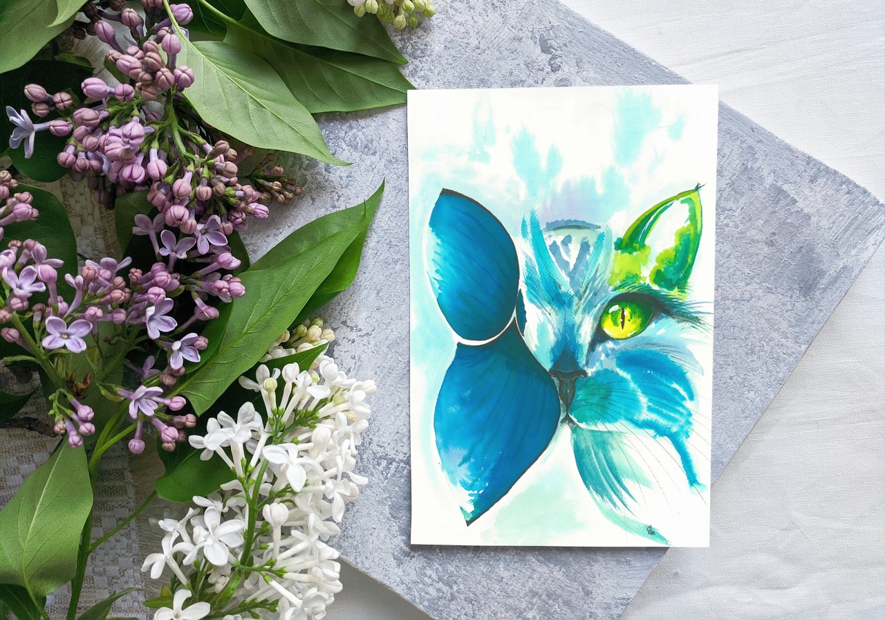 Visage chat / demi papillon. Dessin réalisé à l’encre sur papier Velin aquarelle 320g. Visage de chat stylisé stylisé, une seule oreille, demi-face papillon. couleurs domiante bleu/turquoise
